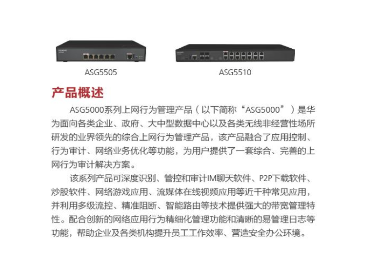 ASG5000系列上网行为管理产品(以下简称“ASG5000”)是华为面向各类企业、政府、大中型数据中心以及各类无线非经营性场所推出的业界领先的综合上网行为管理产品。